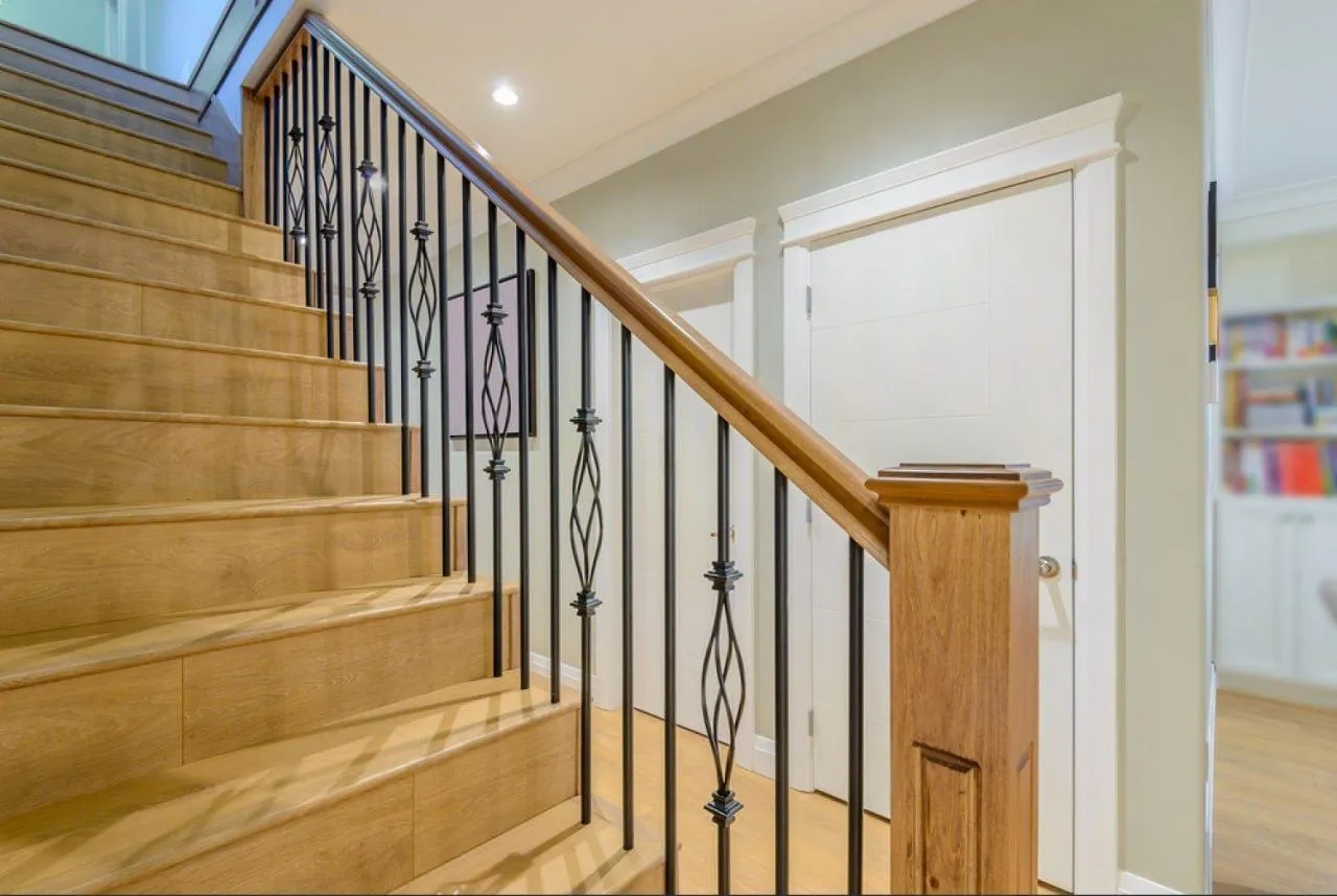 Этот проект — образец того, как практичность и продуманный дизайн создают безупречную гармонию. Мы выполнили отделку прямого бетонной лестницы, превратив ее в статусный элемент интерьера. Ключевыми особенностями стали эффектное сочетание теплого бука с ковкой и продуманная система подсветки, которая добавляет комфорта.